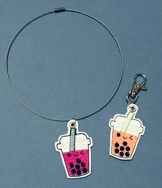 This charm is machine embroidered on to marine vinyl. You can choose between just purchasing the charm, or you can add a choker so you can wear it or a clip, making it ideal to add to a key chain or as a zipper pull.